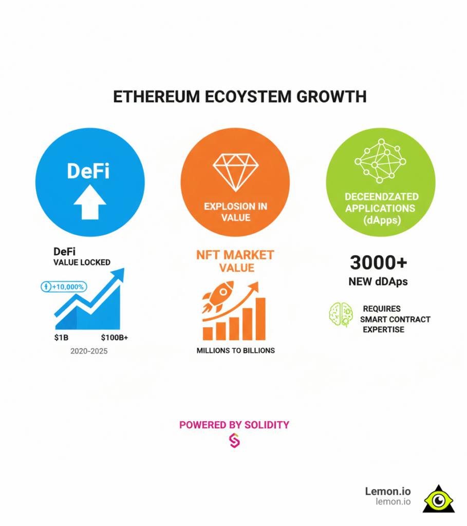 Solidity powers the Ethereum Virtual Machine (EVM), a global, decentralized computer. Every dApp, DeFi protocol, and NFT marketplace runs on Solidity. While its syntax is similar to JavaScript, writing Solidity requires a different mindset, as developers create digital laws governing high-value transactions.