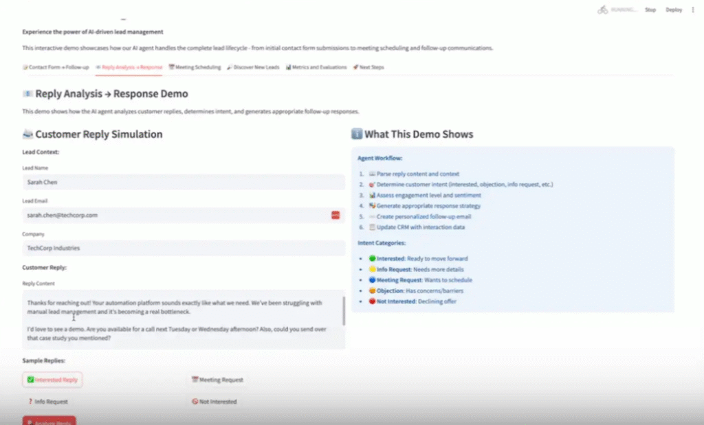 2. Email Analysis and Fast Replies: When a lead writes back, the agent reads their reply, figures out what they want (“I’m interested” vs. “Tell me more” vs. “Please remove me”), and drafts the perfect follow-up. You can send it as-is, or tweak if you’re feeling picky.