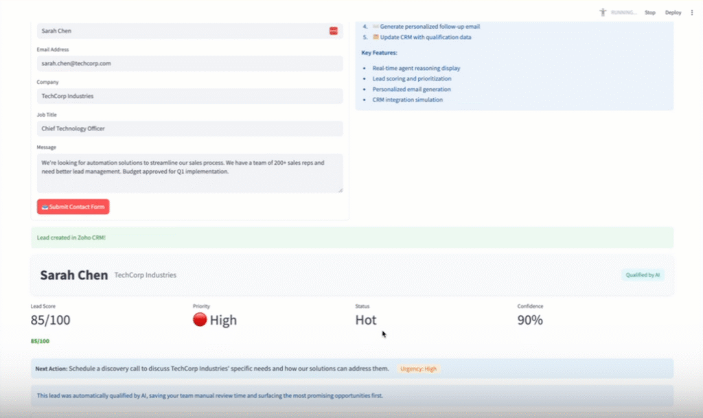 1. Lead Qualification: Someone fills a contact form? The AI reviews the info, scores the lead, and shows you why. If there’s something worth your time, you see it instantly. If not, it doesn’t clog up your to-do list.