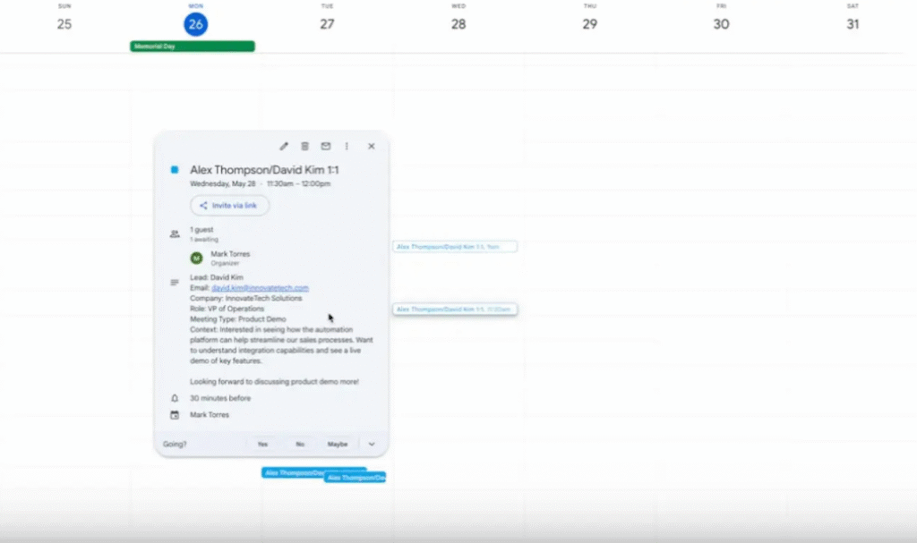 - Schedules meetings straight to your Google Calendar, sends the invite, the follow-up, and even the “see you soon”—no endless back-and-forth.
