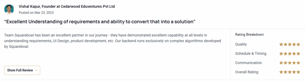 • Squareboat provides in-house engineers with real, long-term product experience, ensuring consistent and dependable delivery.