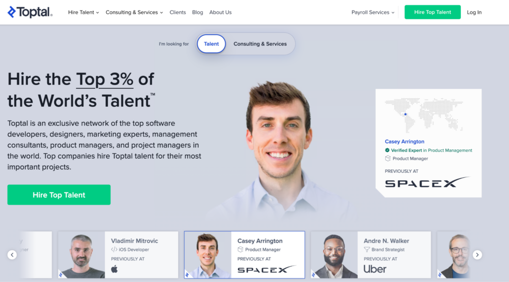 Toptal is often cited alongside Lemon.io as one of the top Upwork alternatives for software development. The platform claims to accept only the top 3% of applicants through an intensive vetting process, and its talent pool includes developers, designers, and project managers across a wide range of industries.